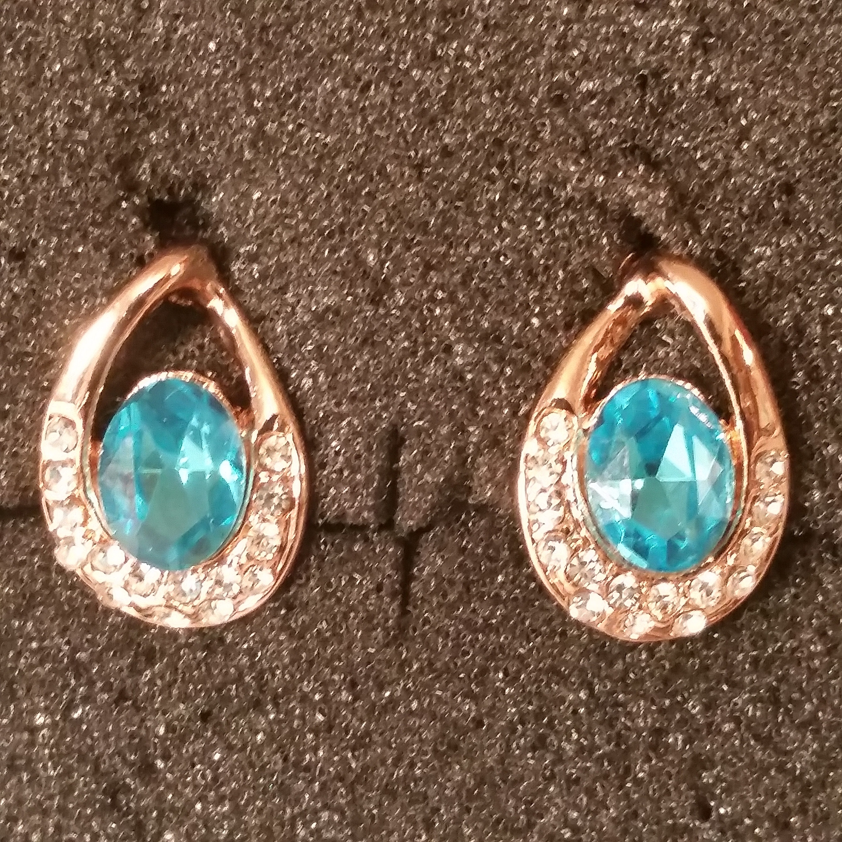 GOLDEN ZINC ALLOY, SEA BLUE AUSTRIAN CRYSTAL AND CLEAR RHINESTONES, BUCKLE STUD EARRINGS