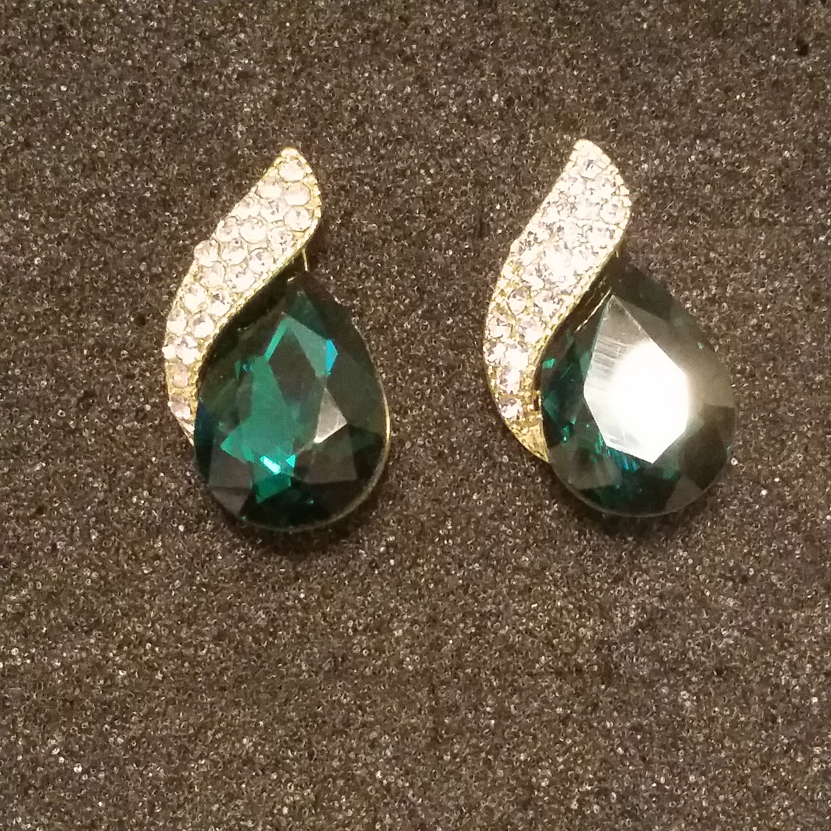 GOLDEN ZINC ALLOY , EMERALD GREEN TEARDROP CRYSTAL IN A CLR RHNSTN LEAF , STUD EARRING