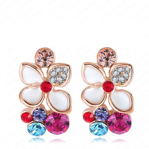 18K ROSE GP(3X PLATING), MULTI COLORED SWAROVSKI CRYSTAL RHNSTNS WITH ENAMEL FLOWER STUD EARRING