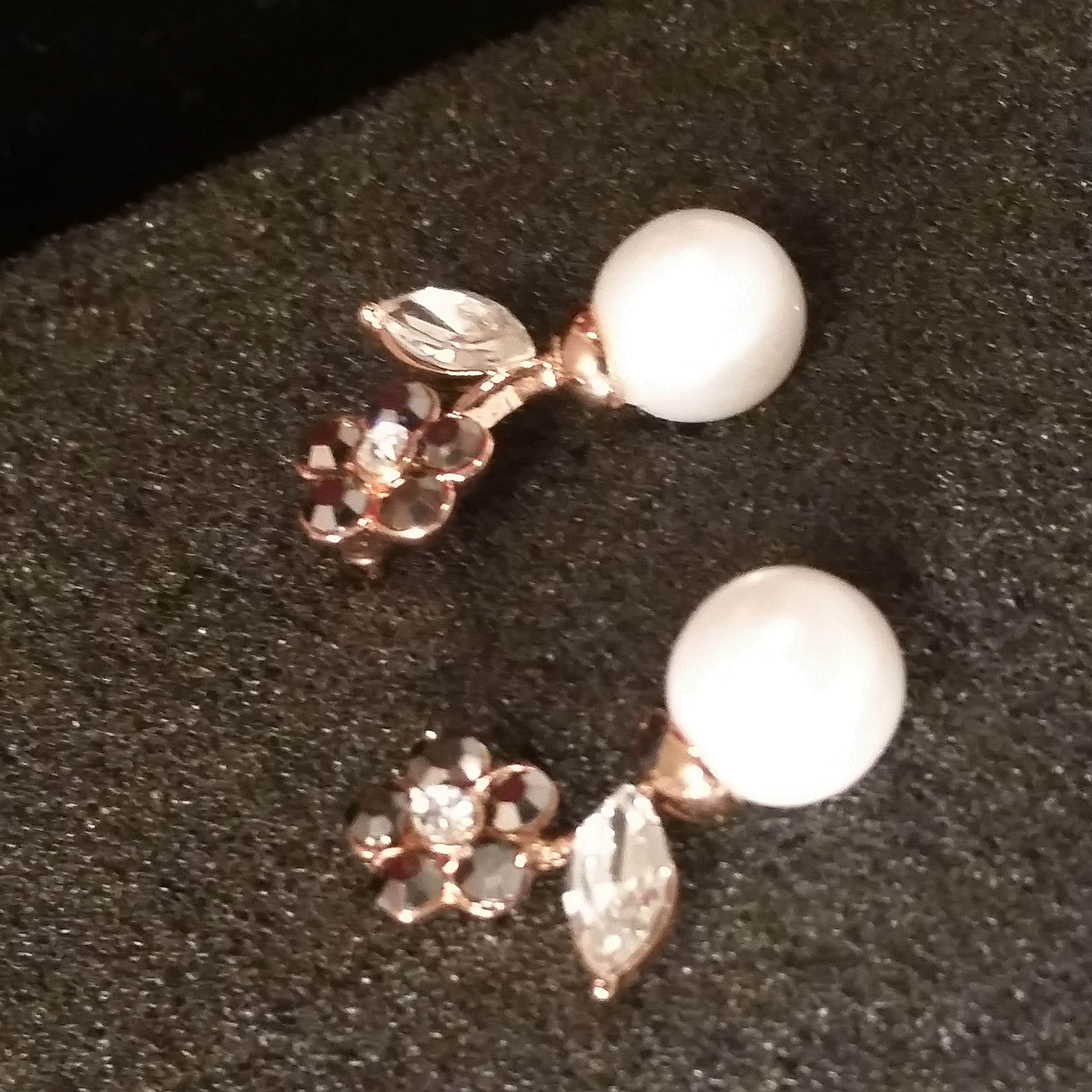 GOLDEN ZINC ALLOY, BLACK AND CLEAR CRYSTAL FLOWER ON WHITE PEARL. STUD EARRING