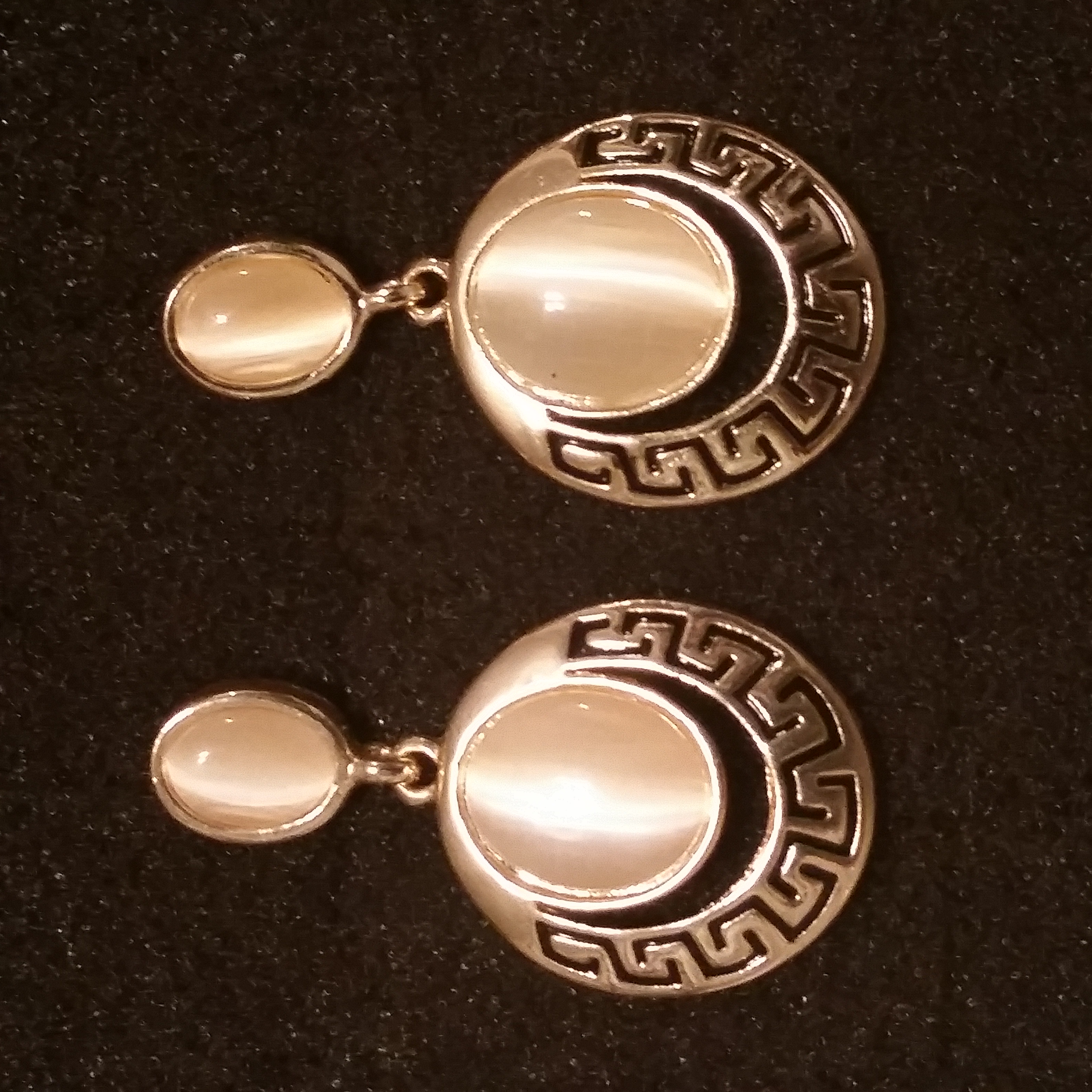 GOLD PLATED, ROUND BEIGE OPAL, ANCIENT DESIGN, POST EARRING