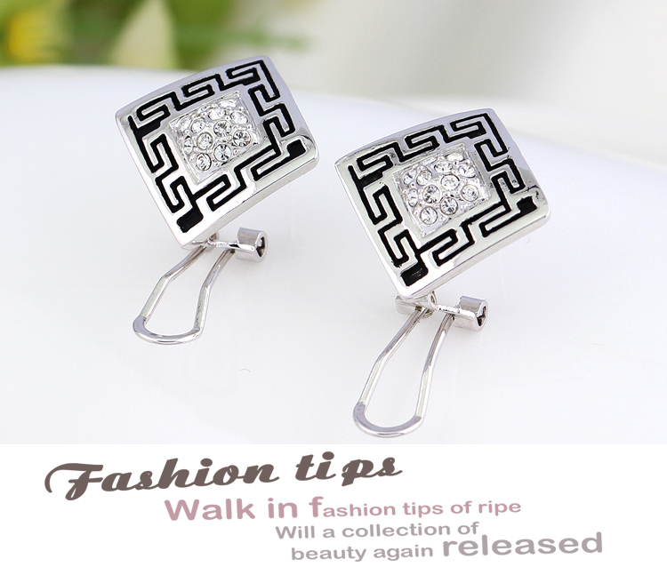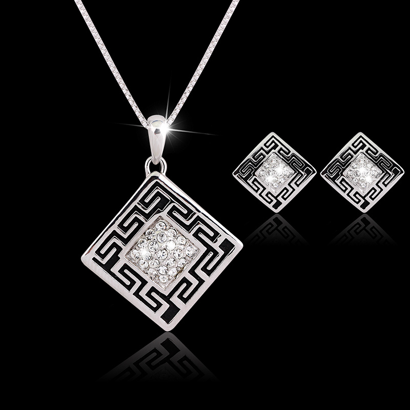 PLATINUM PLATED, SQUARE ANCIENT STYLE WITH CLR AUSTRIAN CRYSTAL RHNSTNES , NECKLACE PENDANT AND STUD BUCKLE EARRING SET