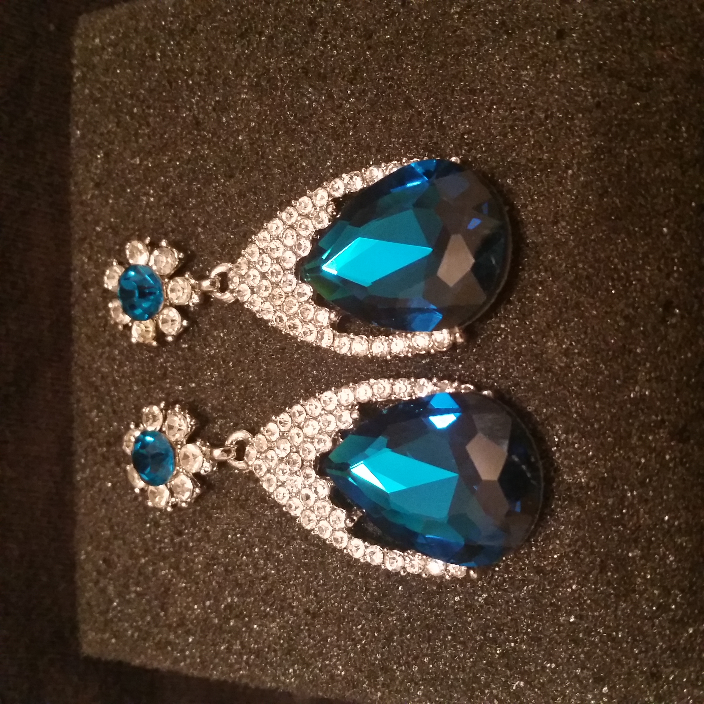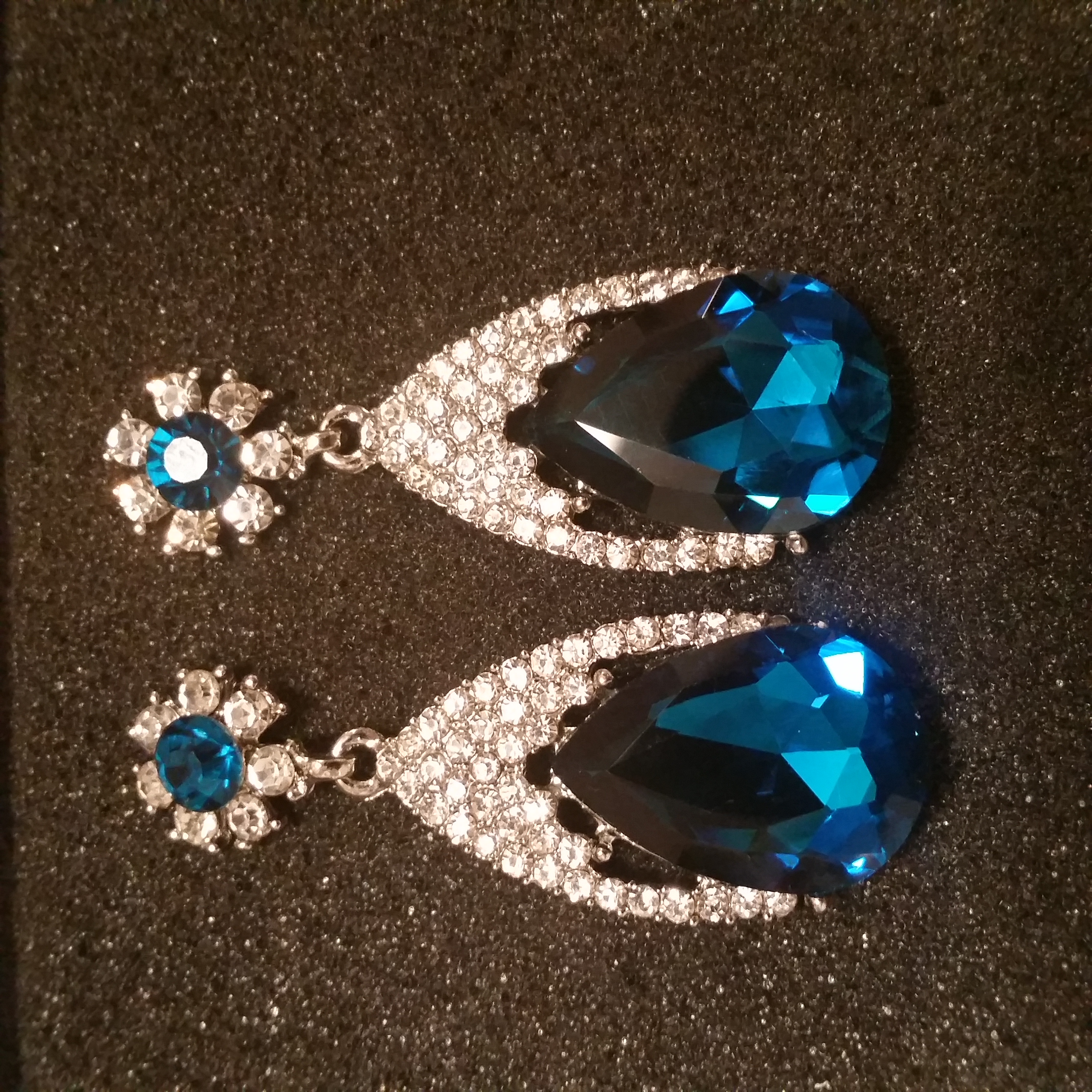 PLATINUM PLATED , DARK BLUE CRYSTAL, CLR RHNSTNS TEARDROP POST EARRING