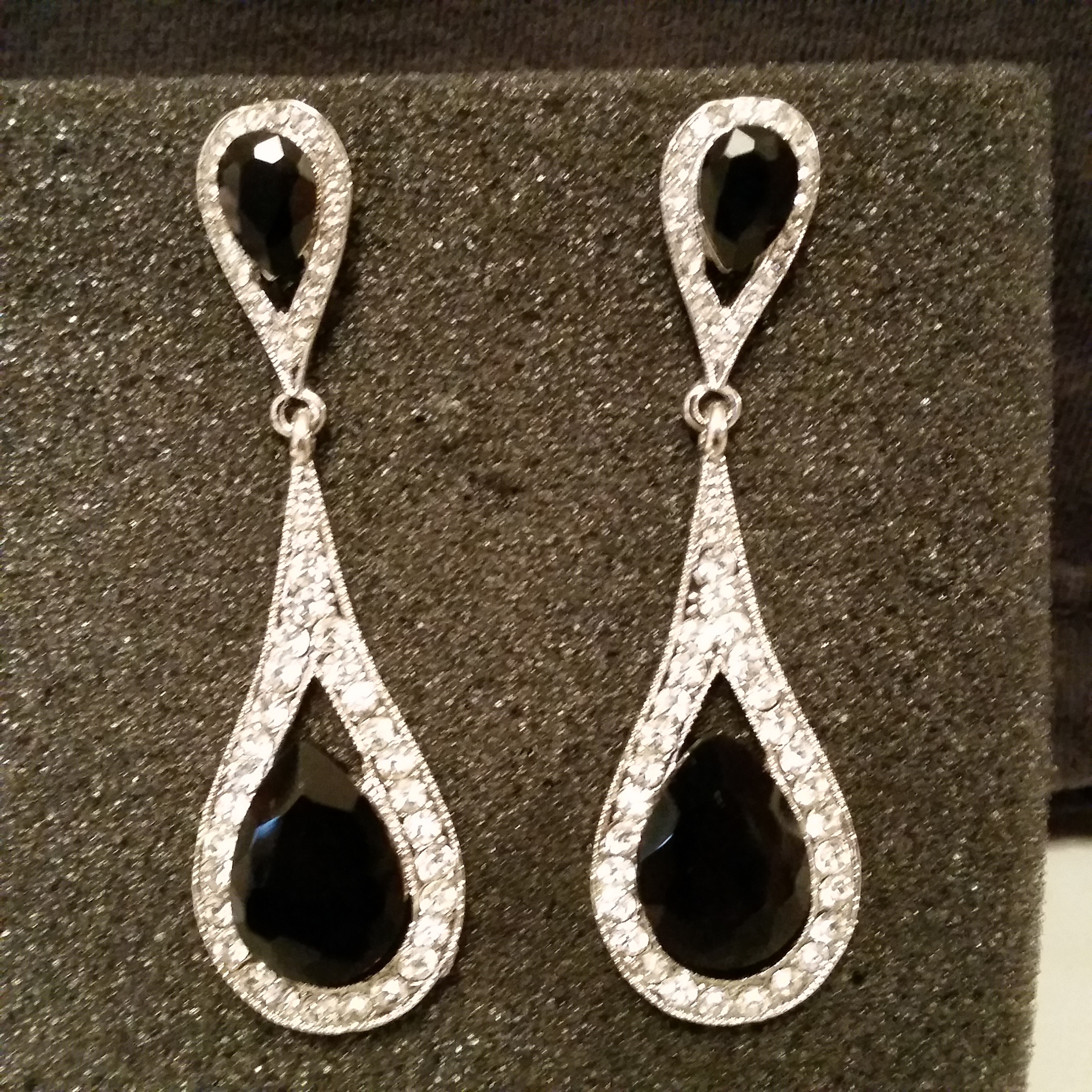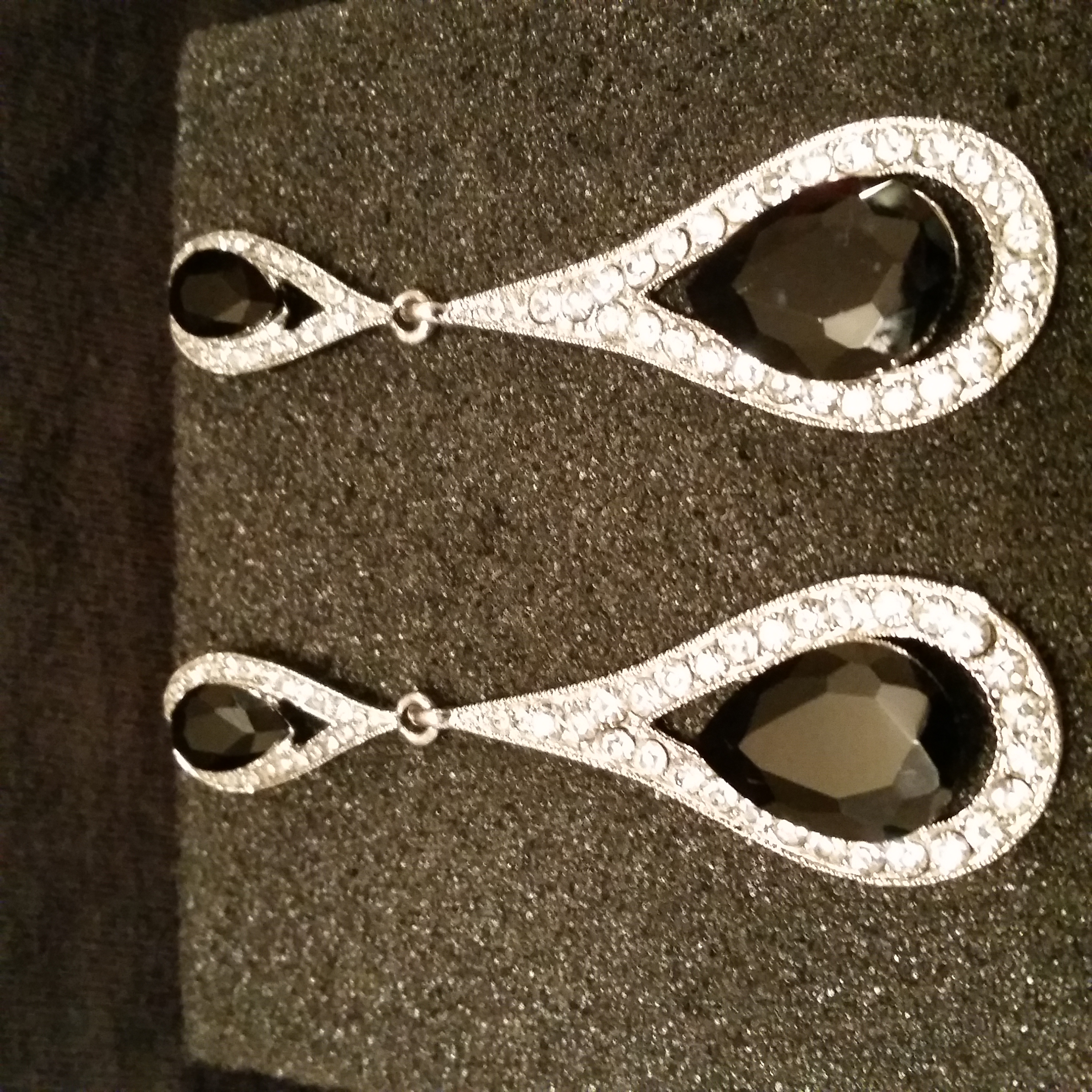 SILVERISH ZINC ALLOY,BLACK TEARDROP CRYSTAL WITH CLR AUSTRIAN RHNSTN POST EARRING