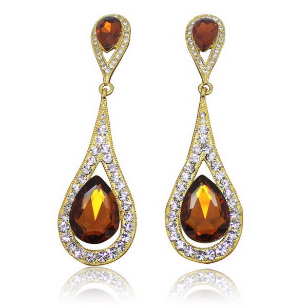 GOLDEN ZINC ALLOY , CHAMPAIGN CRYSTAL, AND CLEAR RHINSTONES. 2.7” L. POST DANGLE EARRING