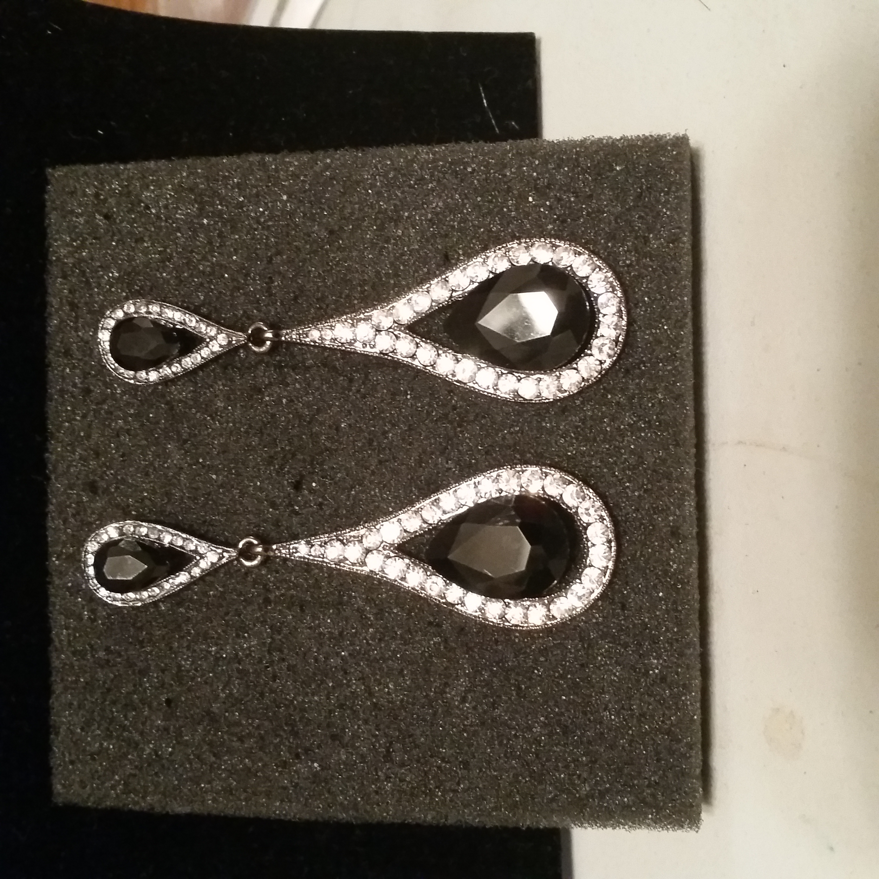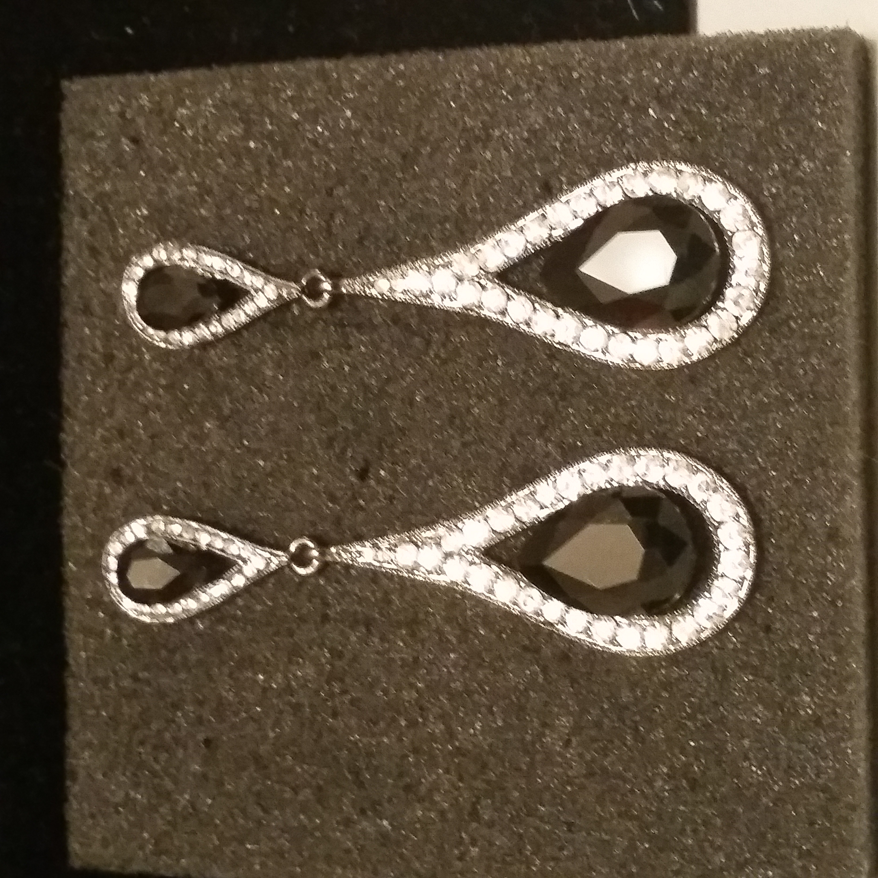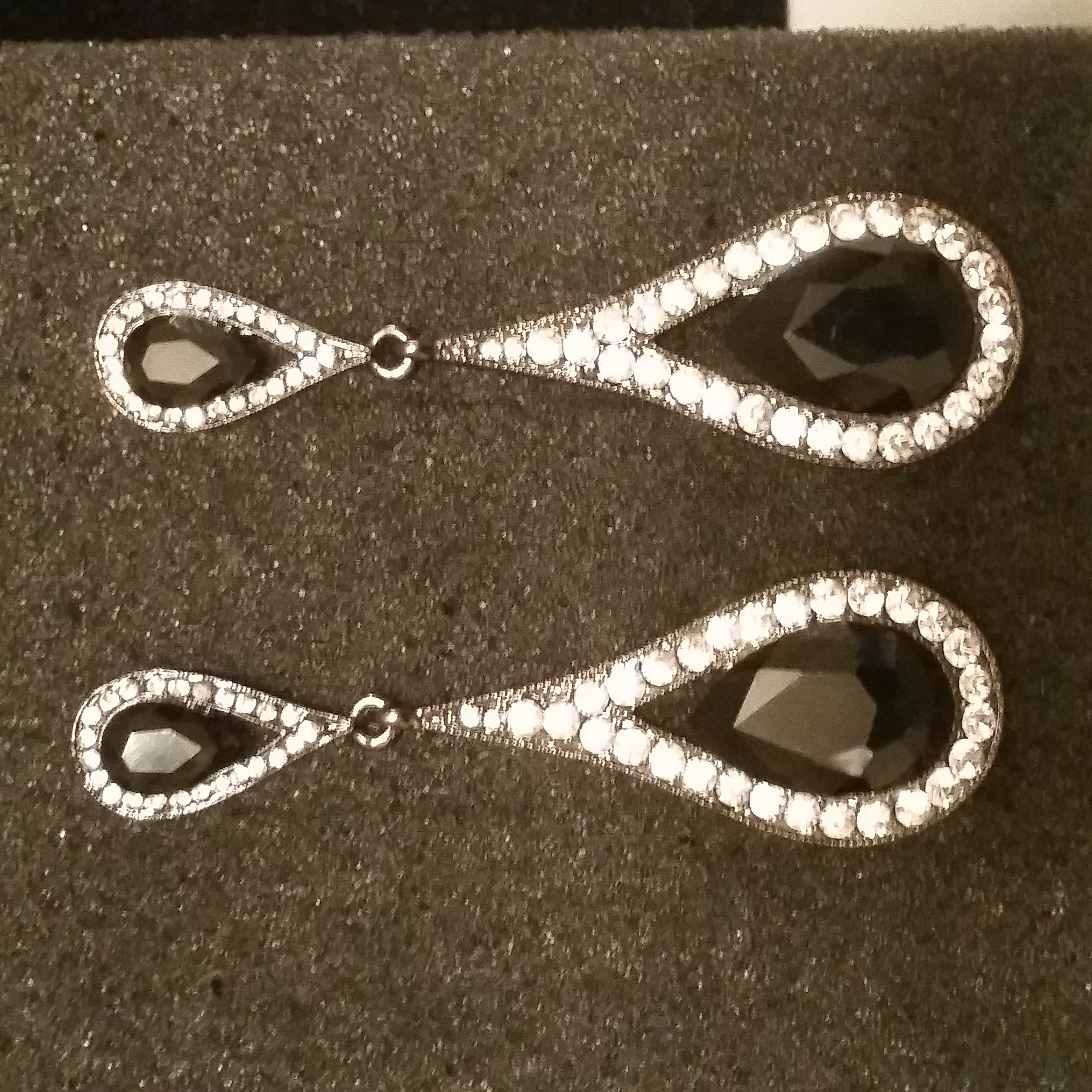 GUNMETAL, BLACK CRYSTAL, AND CLEAR RHINSTONES. 2.7” L. POST DANGLE EARRING