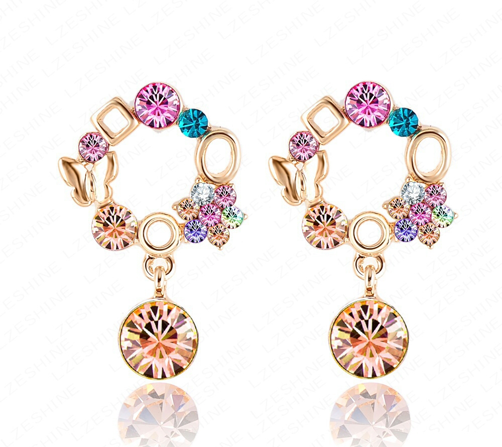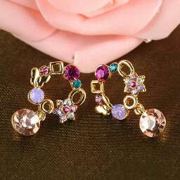 3X 18K GP, MULTI COLORED SWAROVSKI AUSTRIAN CRYSTAL RHNSTN IN WREATH WITH PEACH RHNSTN DANGLE EARRING