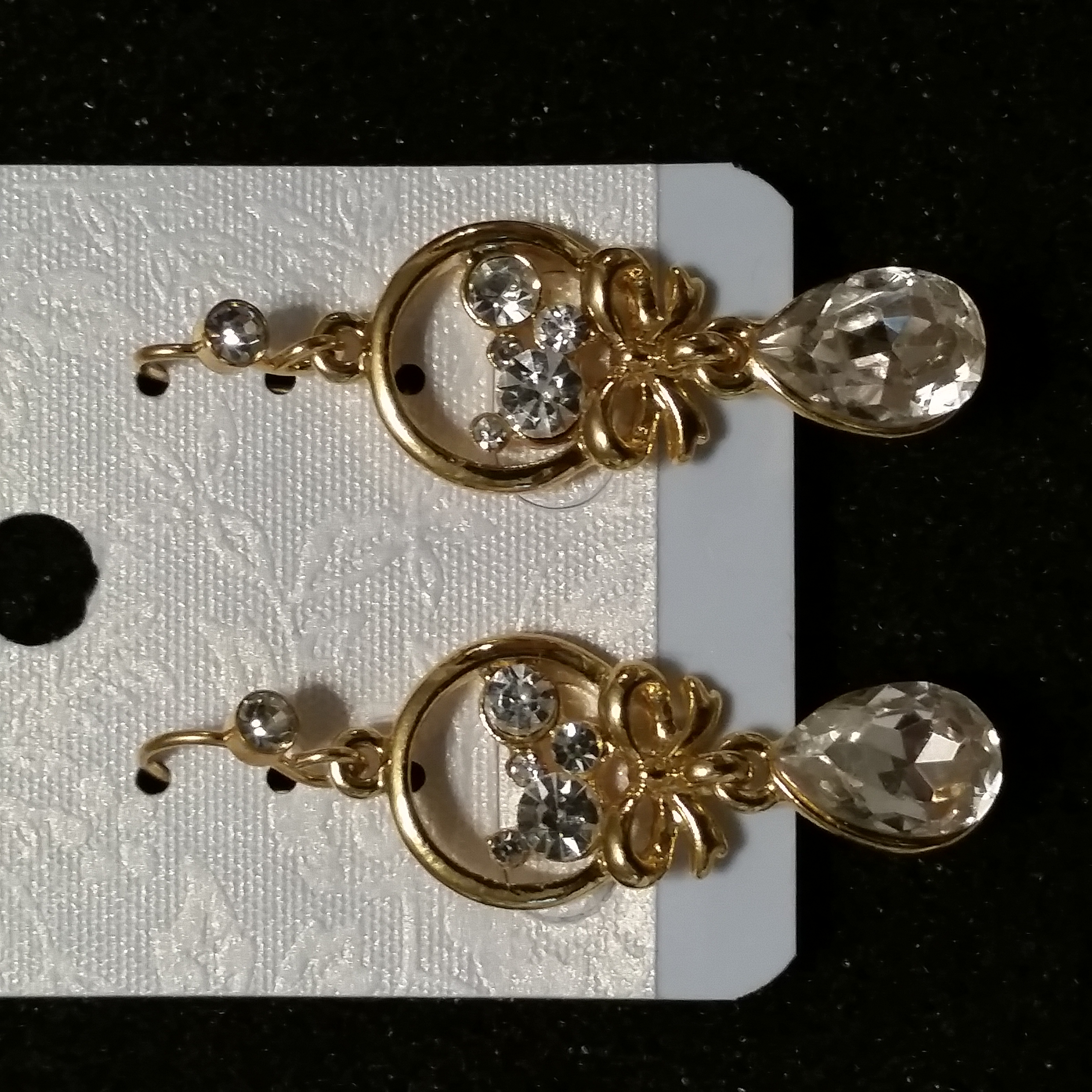 3X 18K GP, AUSTRIAN CRYSTAL TEARDROP DANGLE, SWAROVSKI CLEAR CRYSTAL RHNSTN BOW HOOK EARRING