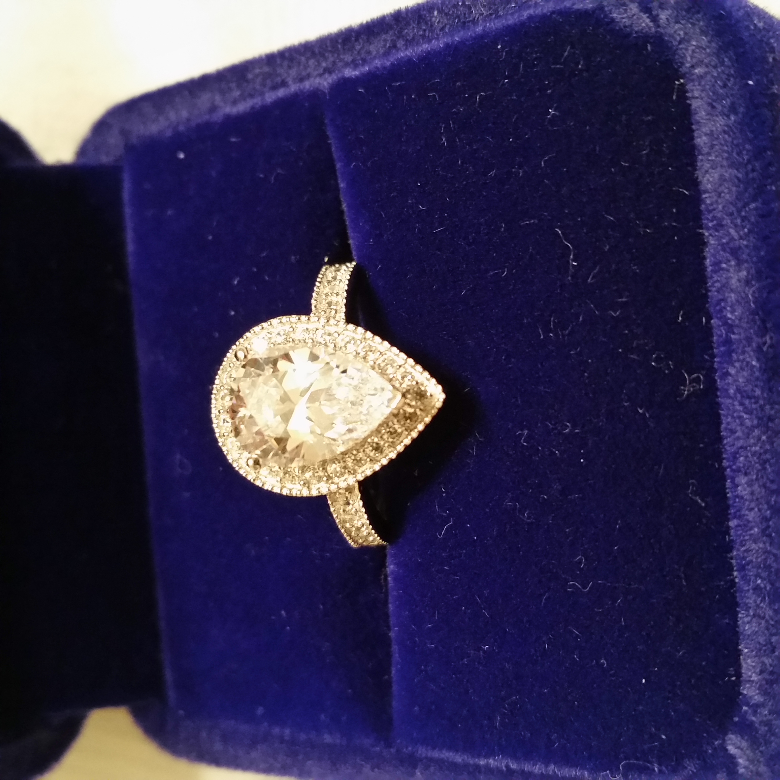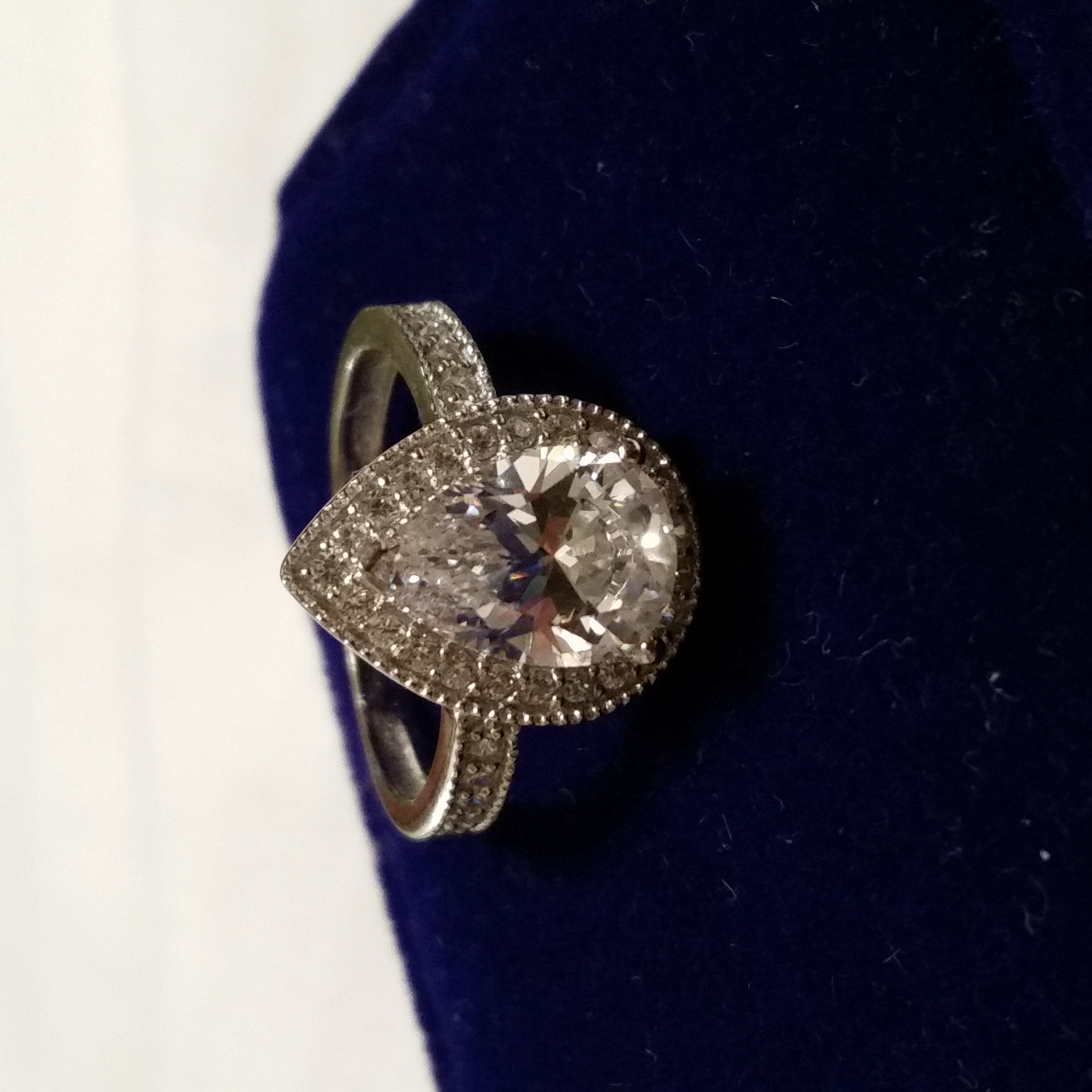 STERLING SILVER 925, RHODIUM PLATED, 2CT PEAR CUT LAB CREATED DIAMOND HALO STYLE W/ ACCENTS SIZE 5